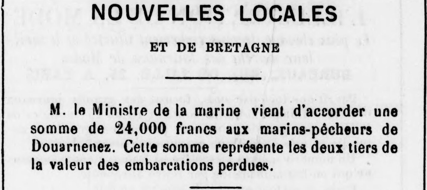 Journal Le Publicateur du Finistère Date 09 January 1880 Mots-clés Ministre de la Marine, Accord, Secours aux pêcheurs, Aide, Tempête de 1879, Naufrages, Dégâts, Pertes Lieu(x) Bretagne, Douarnenez Contributeur(s) Jacques Join Image