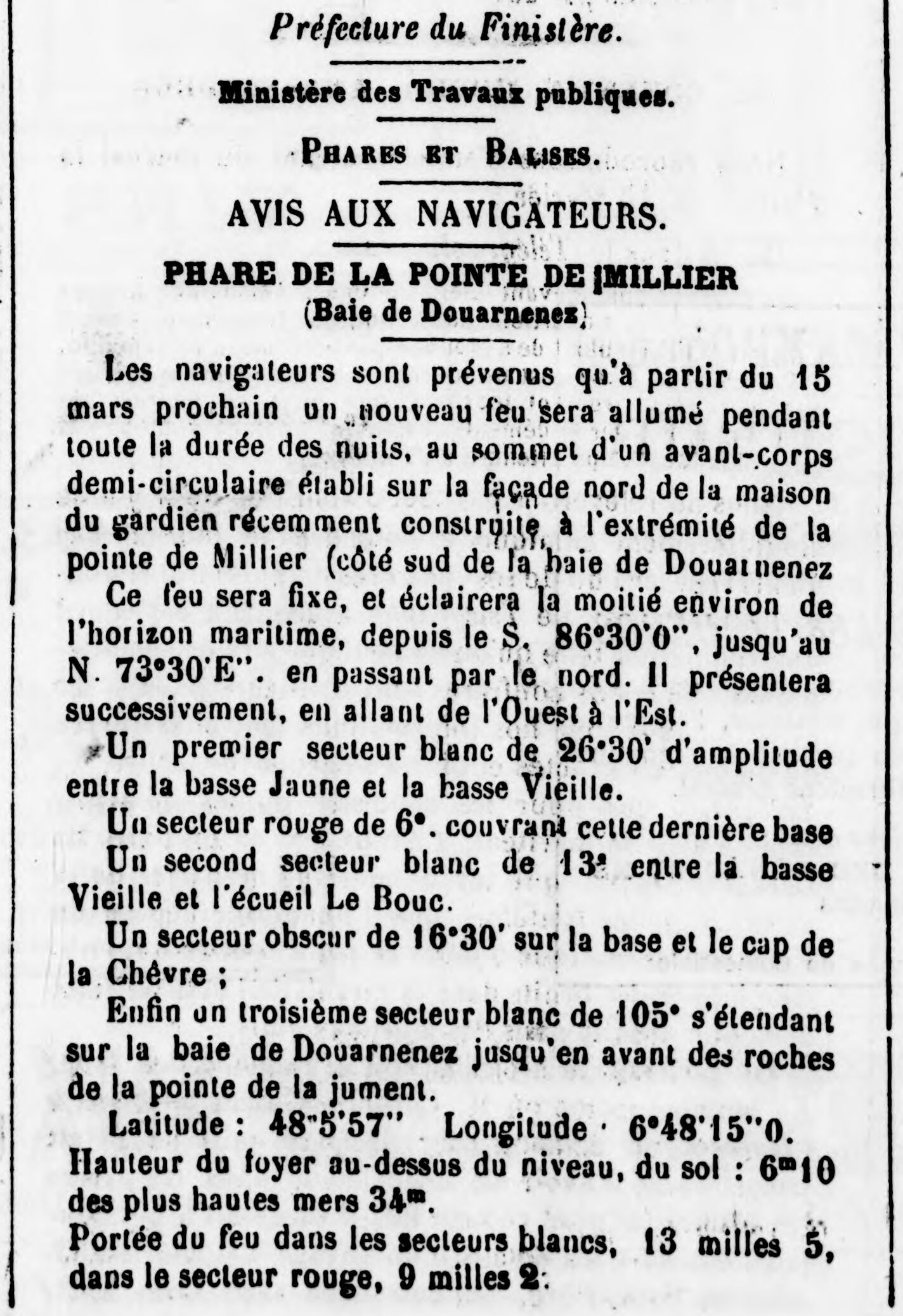 Journal Le Publicateur du Finistère Date 18 February 1881 Mots-clés Avis aux navigateurs, Phare, Nouveau, Feu fixe Lieu(x) Pointe du Millier, Baie de Douarnenez, Basse Jaune du Raz, Basse Vieille, Le Bouc, Cap de la Chèvre, Pointe de la Jument Contributeur(s) Jacques Join Image