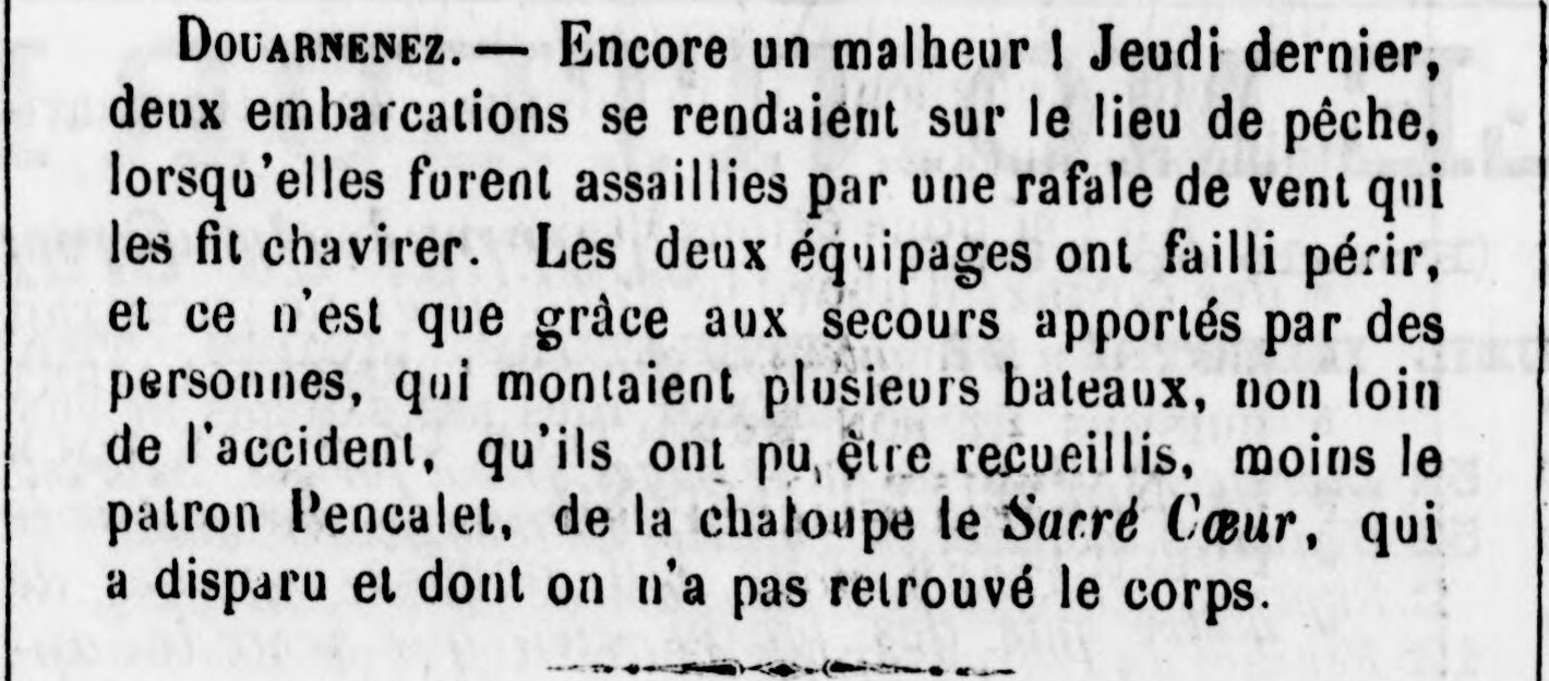 Journal Le Publicateur du Finistère Date 20 October 1882 Bateau(x) SACRÉ COEUR - ADZ933 Chaloupe - 1877-1890 Mots-clés Chaloupes, Rafale, Accident, Chavirage, Secours, Équipage sauvé, Recherches, Corps, Patron, Disparu en mer Lieu(x) Douarnenez Personnes patron Pencalet Contributeur(s) Jacques Join Image