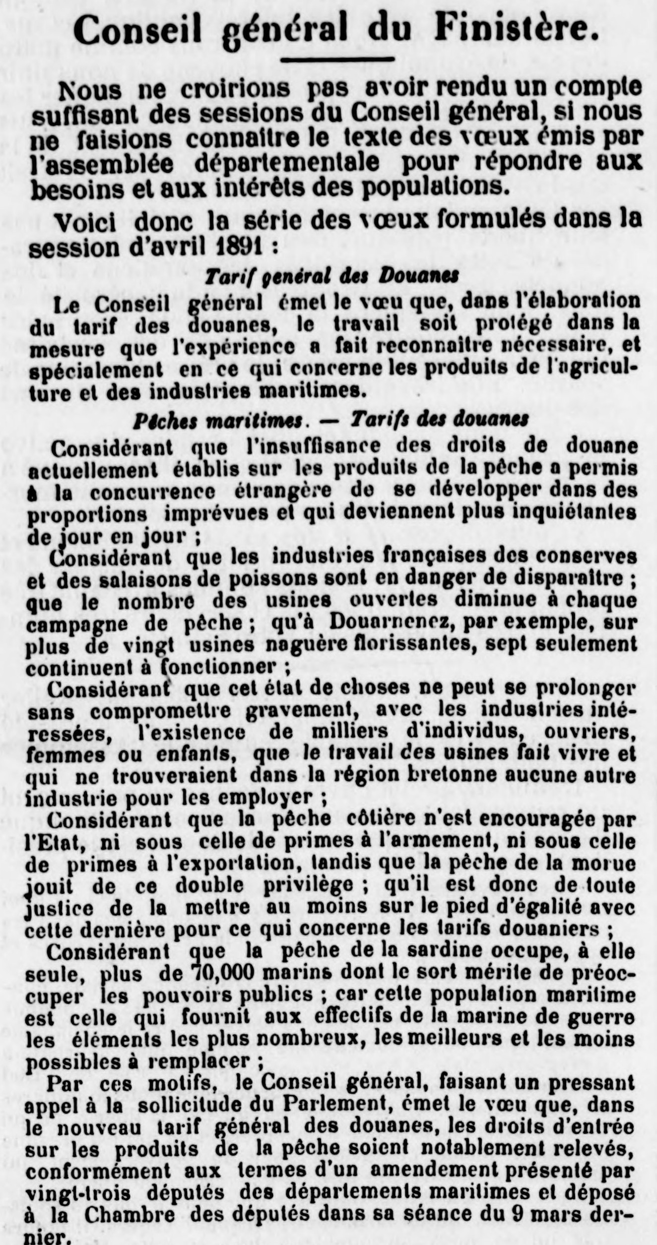 Conseil général, Compte-rendu, Vœux, Droits de douane, Insuffisant, Concurrence étrangère, Usines, Conserves, Salaison, Industrie de la pêche, Emploi, Pêche côtière, Encouragement, Primes, Armement, Exportation, Pêche à la sardine, Pouvoirs publics, Population maritime, Marine de guerre, Effectifs, Appel, Parlement, Relèvement, Tarifs, Produits de la pêche, Amendement, Députés