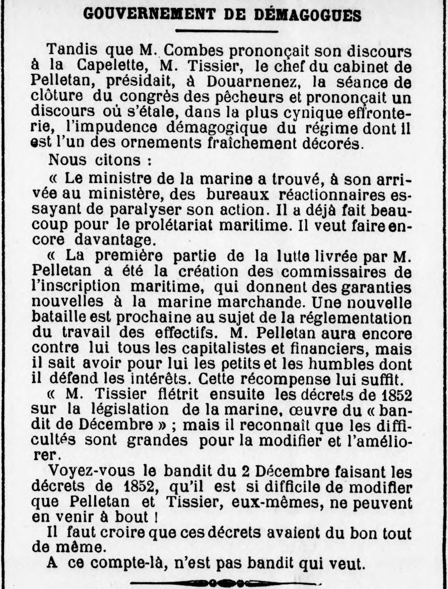 Journal Le Publicateur du Finistère Date 14 August 1903 Mots-clés Gouvernement, Démagogie, Congrès, Pêcheurs, Clôture, Discours, Ministre de la Marine, Commissaire de la marine, Modification, Législation, Amélioration, Décret Lieu(x) Douarnenez, La Capelette, Marseille Personnes MM. Combes, Tissier, Pelletan Contributeur(s) Jacques Join Image