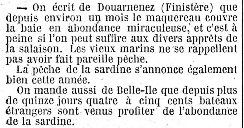 Journal Journal des débats Date 08 August 1856 Mots-clés Pêche au maquereau, Baie, Abondance, Pêche miraculeuse, Salaison, Pêche à la sardine Lieu(x) Douarnenez, Finistère, Baie de Douarnenez, Belle-Île Contributeur(s) Jacques Join Image