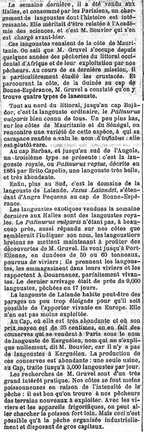 Journal Journal des débats Date 01 December 1910 Mots-clés Vente, Halles, Chargement, Langoustes, Histoire, Académie des sciences, Étude, Crustacés, Catégories, Langouste royale, Langouste de Lalande, Pêcheurs bretons, Dundées, Viviers, Langouste vivante, Langouste de Kerguélen, Conserves, Organisation, Pêche industrielle, Capitaux Lieu(x) Paris, Mauritanie, Afrique, Guinée, Cap de Bonne-Espérance, Cap Bojador, Sénégal, Cap Barbas, Angola, Port-Étienne (Nouadhibou), Douarnenez, Le Cap, Afrique du Sud Personnes MM. Bouvier, Gruvel, Brito Capello Contributeur(s) Jacques Join Image