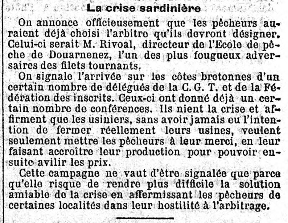 Journal Journal des débats Date 28 April 1913 Mots-clés Crise sardinière, Pêcheurs, Désignation, Commission arbitrale, Directeur, École de pêche, Opposition, Filets tournants, Délégués, CGT, Conférence, Usiniers, Chantage, Fermeture, Augmentation, Production, Avilissement, Prix Lieu(x) Douarnenez Personnes M. Rivoal Contributeur(s) Jacques Join Image