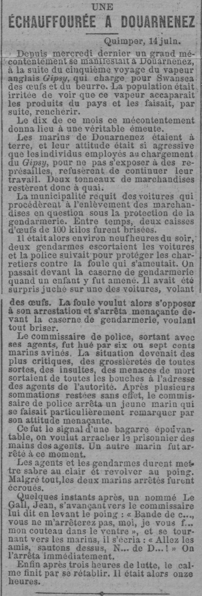 Vapeur, Voyage, Mécontentement, Population, Cargaison, Beurre, OEufs, Émeute, Municipalité, Enlèvement, Marchandises, Protection, Gendarmerie, Police, Enfant, Chapardage, Opposition, Foule, Arrestation, Commissaire de police, Insultes, Menaces, Agents de police, Sommation, Marins, Prison, Lutte, Rétablissement, Calme