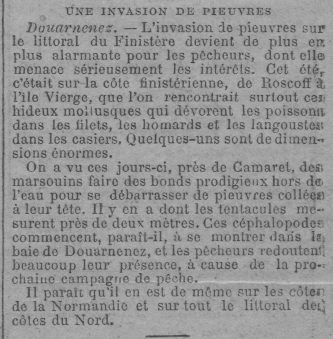 Journal Gil Blas Date 18 December 1899 Mots-clés Invasion, Pieuvres, Littoral, Menace, Pêcheurs, Mollusques, Dégâts, Filets, Casiers, Homards, Langoustes, Marsouins, Apparition, Céphalopodes, Baie, Crainte, Campagne de pêche Lieu(x) Finistère, Roscoff, Île Vierge, Baie de Douarnenez, Normandie, Nord, Douarnenez, Camaret Contributeur(s) Jacques Join Image