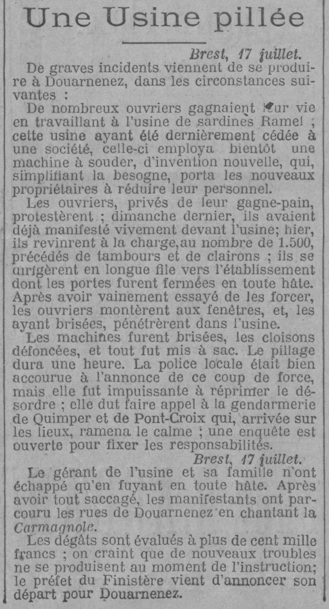 Journal Gil Blas Date 18 July 1902 Mots-clés Incidents, Usine de conserves, Ouvriers, Soudeurs, Protestation, Manifestation, Destruction, Saccage, Pillage, Police, Désordre, Renforts, Gendarmerie, Enquête, Responsabilité, Chants, La Carmagnole, Dégâts, Évaluation, Instruction, Troubles, Préfet Lieu(x) Brest, Douarnenez, Quimper, Pont-Croix Personnes usine Ramell Contributeur(s) Jacques Join Image