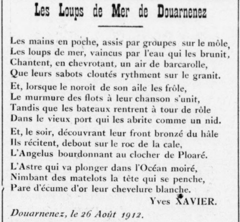 Journal La Côte d'Armor : Echo des plages de Basse Bretagne Date 07 September 1912 Mots-clés Poésie, Poème, Poète, Loup de mer, Môle, Chansons, Sabots, Cale, L'Angélus, Clocher, Matelots Lieu(x) Douarnenez, Ploaré Personnes Yves Xavier Contributeur(s) Jacques Join Image