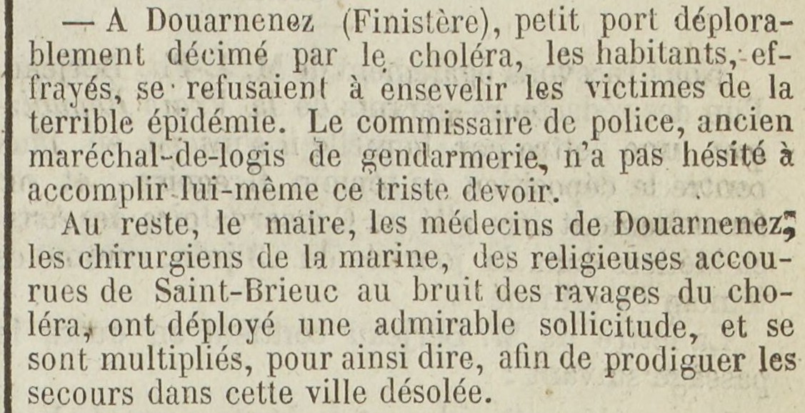 Journal La Démocratie pacifique Date 29 October 1849 Mots-clés Épidémie, Choléra, Inhumation, Victimes, Commissaire de police, Maire, Médecins, Chirurgiens de la marine, Religieuses, Ravages, Désolation, Secours Lieu(x) Douarnenez, Finistère, Saint-Brieuc Contributeur(s) Jacques Join Image