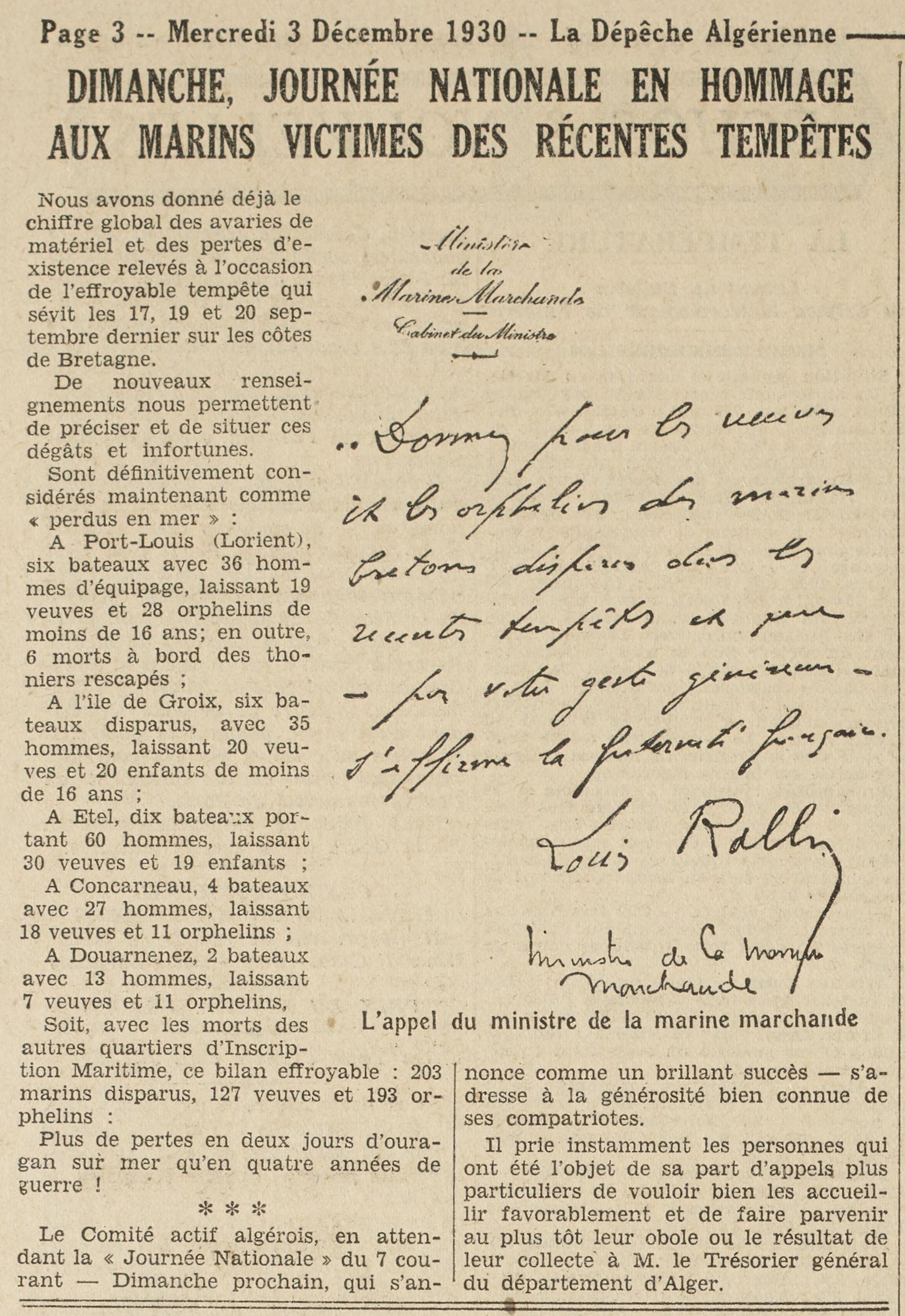 Journal La Dépêche algérienne Date 03 December 1930 Bateau(x) GLAZ BIHEN - DZ2579 Dundee - 1924-1930 STEREDEN AR MINTIN - DZ2586 Dundee à moteur - 1924-1930 Mots-clés Tempête de 1930, Hommage, Victimes, Chiffres, Avaries, Pertes, Disparus, Veuves, Orphelins, Rescapés, Bilan, Ouragan, Comité, Générosité, Obole, Collecte, Appel, Ministre de la Marine marchande Lieu(x) Bretagne, Port-Louis, Lorient, Groix, Étel, Concarneau, Douarnenez, Tréboul, Alger Personnes Louis Rollin Contributeur(s) Jacques Join Image