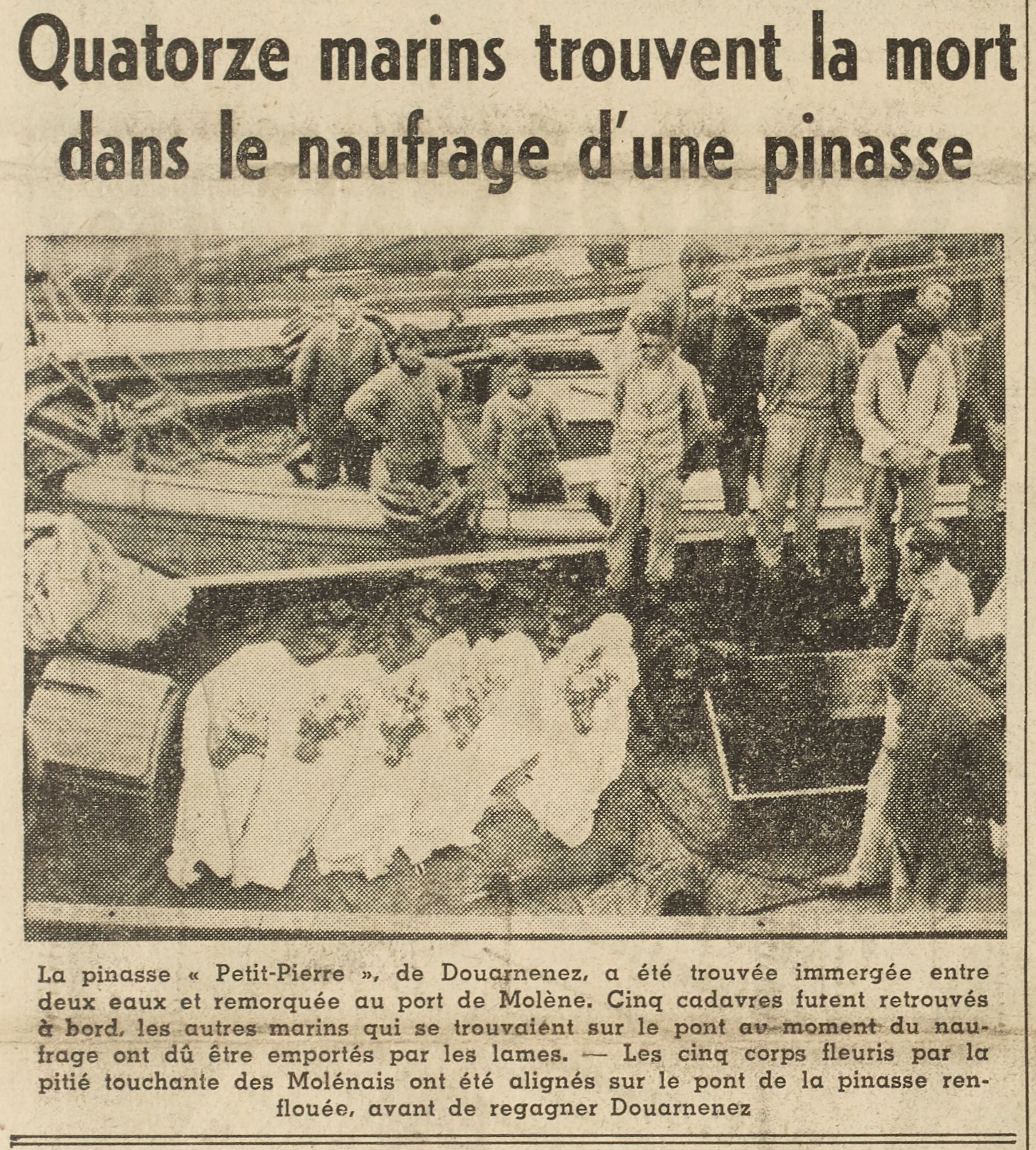 Journal La Dépêche algérienne Date 06 June 1938 Bateau(x) PETIT PIERRE - DZ3304 Pinasse - 1937-1945 Mots-clés Naufrage, Pinasse, Remorquage, Découverte, Cadavres, Lame, Disparus en mer, Corps, Fleurs, Renflouement, Retour au port Lieu(x) Douarnenez, Molène Contributeur(s) Jacques Join Image