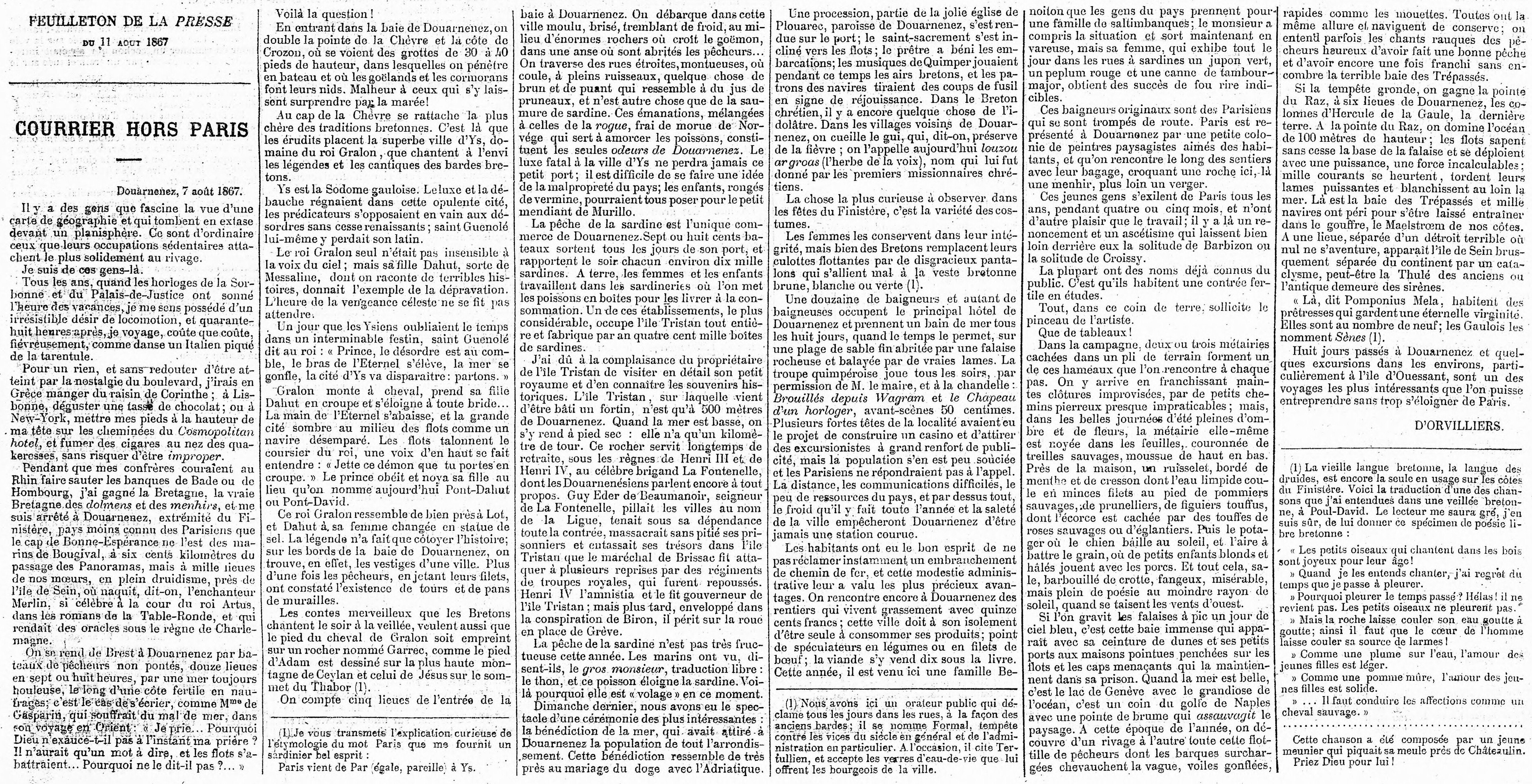 Voyage, Vacances, Dolmens, Menhirs, Traversée, Bateau de pêche, Naufrages, Grottes, Ville d'Is, Traditions, Légendes, Contes, Merveilleux, Bretons, Rogue de Norvège, Rogue de morue, Odeur, Saleté, Enfants, Pêche à la sardine, Commerce, Chaloupes, Femmes d'usine, Mise en boîte, Histoire, Brigand, Guerre de la Ligue, Pillage, Thon, Grand poisson - "Pesk bras", Bénédiction de la mer, Procession, Église, Prêtre, Musique, Gui - "louzou ar groas", Costumes, Baigneurs, Hôtel, Plage, Casino, Touristes, Excursion, Publicité, Station, Chemin de fer, Parisiens, Peintres, Artistes, Tableaux, Baie, Flottille, Barques, Voiles, Chants, Chansons, Langue bretonne