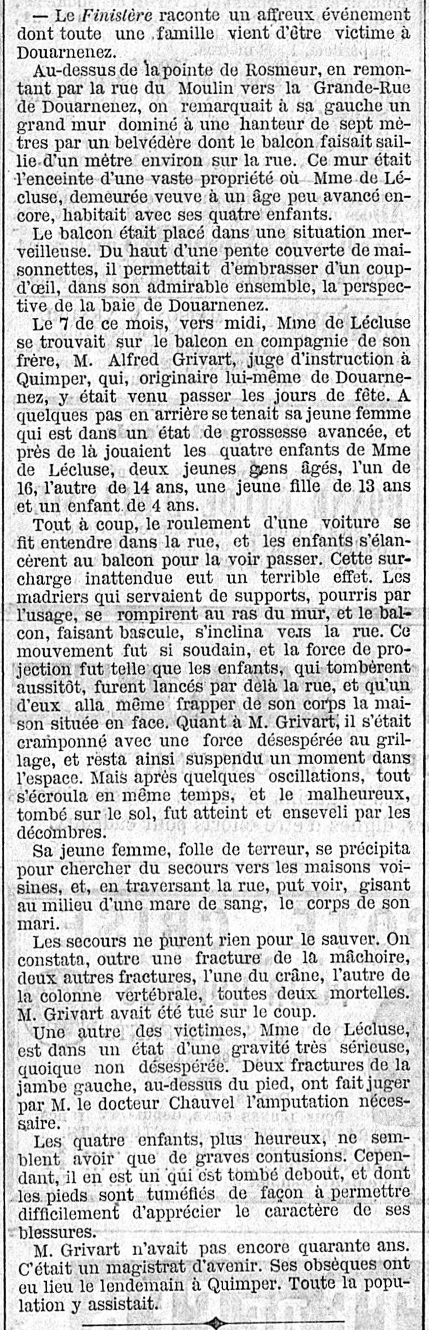 Journal Le Temps Date 13 August 1872 Mots-clés Journal, Événement, Famille, Victimes, Balcon, Surcharge, Accident, Chute, Enfants, Juge d'instruction, Secours, Fracture crânienne, Mort, Blessés, Amputation, Contusions, Obsèques, Magistrat, Population Lieu(x) Douarnenez, Pointe de Rosmeur, Rue du Moulin, Grande-Rue, Baie de Douarnenez, Quimper Personnes Mme de Lécluse, Alfred Grivart, Dr Chauvel Contributeur(s) Jacques Join Image