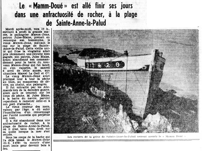 Journal Ouest-France Date 16 October 1958 Bateau(x) MAMM DOUE - DZ3479 Malamok - 1941 MAMM DOUE - DZ3959 - DZ184974 Malamok - 1958 Mots-clés Grande marée, Palangrier, Retraite, Thon, Maquereau de dérive, Chalut, Palangre, Mitraillage, Allemands, Guerre, Lieux de pêche, Remorquage, Rocher, Quille, Hache, Bois de feu Lieu(x) Sainte-Anne-la-Palud, Chantier Marcel Le Gall, Port-Rhu Personnes Jules Blaise, Contributeur(s) Audierne Bateaux Image