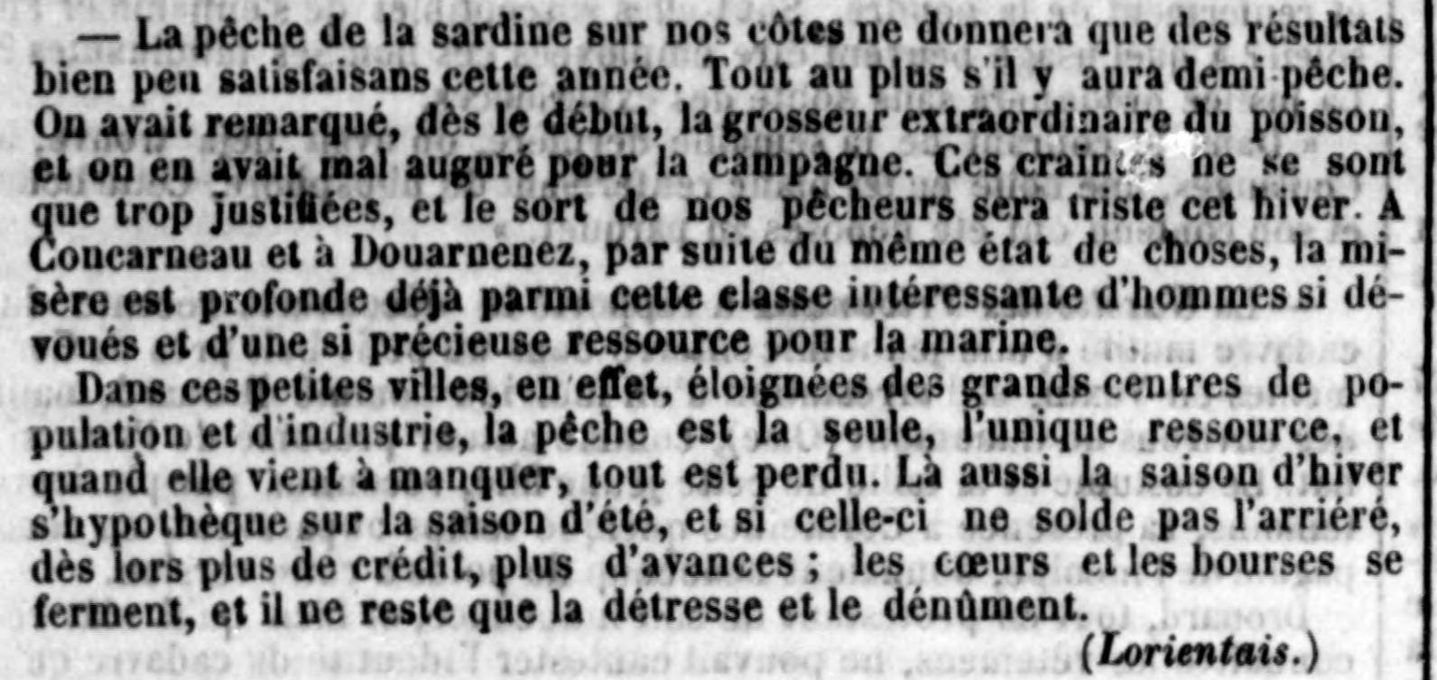 Journal L'Echo français Date 31 August 1846 Mots-clés Pêche à la sardine, Résultats, Grosseur, Pêcheurs, Crainte, Hiver, Misère, Manque, Ressources, Crédit, Avances, Détresse, Dénuement Lieu(x) Concarneau, Douarnenez Contributeur(s) Jacques Join Image