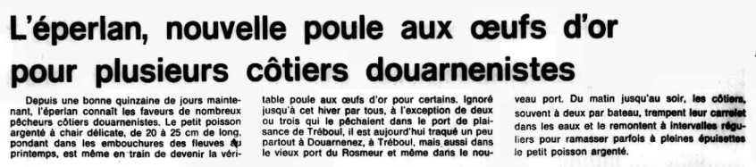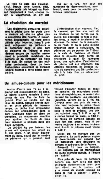 Journal Ouest-France Date 16 March 1978 Bateau(x) SERGE ET CÉDRIC - DZ184944 Ligneur, Divers - 1975 Mots-clés Carrelet, Côtier, Éperlan, Filet droit, Ponton, Autorisation de pêche, Affaires maritimes, Rentabilité, Ressac, Apéritif, Bar Lieu(x) Douarnenez, Tréboul, Rosmeur, Morgat, Portsall, Boulogne, Île de Sein, Raz de Sein Contributeur(s) Audierne Bateaux - JCB Image