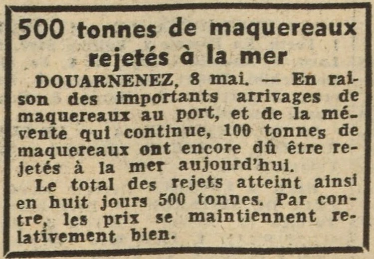 Journal Combat Date 09 May 1951 Mots-clés Maquereaux, Arrivages importants, Mévente, Rejet à la mer, Maintien, Prix Lieu(x) Douarnenez Contributeur(s) Jacques Join Image