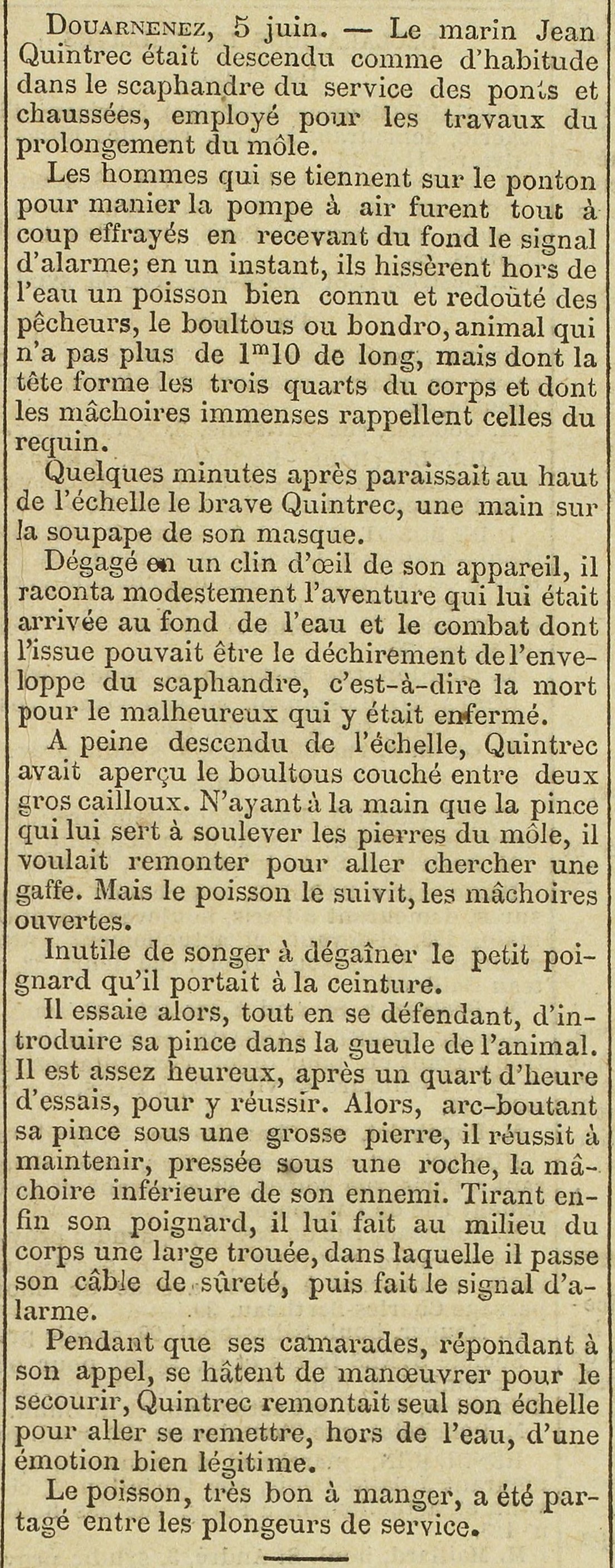 Journal La Liberté Date 07 June 1887 Mots-clés Scaphandrier, Ponts et Chaussées, Travaux du port, Prolongement, Môle, Signal d'alarme, Boultous, Baudroie, Danger, Combat, Lutte, Mort, Poignard, Câble, Secours, Échelle, Plongeurs, Partage, Lotte Lieu(x) Douarnenez Personnes Jean Quintrec Contributeur(s) Jacques Join Image