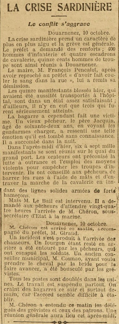 Crise sardinière, Conflit, Aggravation, Grève générale, Préfet, Demande, Renforts, Troupes, Maire, Démission, Manifestation, Blessés, Transport, Hôpital, Bagarre, Victime, Vieux marin, Décès, Intervention, Député, Arrivée, Secrétaire d'Etat à la Marine, Incident, Soldats, Bousculade, Suspension, Travail, Usines, Délégués, Réunion