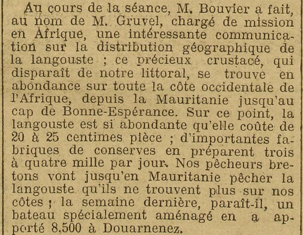 Journal La Liberté Date 30 November 1910 Mots-clés Académie des sciences, Communication, Lieux de pêche, Pêcheries, Langouste, Crustacé, Abondance, Pêcheurs bretons, Apport, Dundée, Langoustier mauritanien Lieu(x) Afrique, Mauritanie, Cap de Bonne-Espérance, Douarnenez Personnes MM. Bouvier, Gruvel Contributeur(s) Jacques Join Image