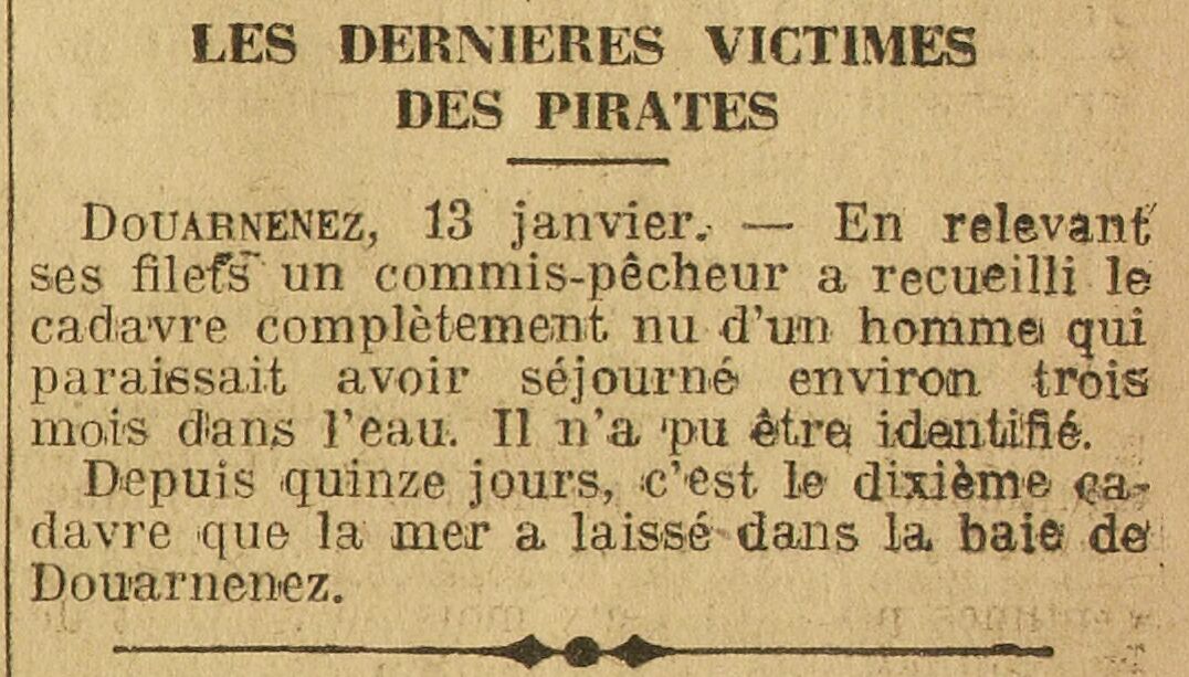Journal La Liberté Date 13 January 1919 Mots-clés Filets, Découverte, Corps, Baie, Identification, Cadavres, Victimes, Pirates, Allemands Lieu(x) Douarnenez, Baie de Douarnenez Contributeur(s) Jacques Join Image