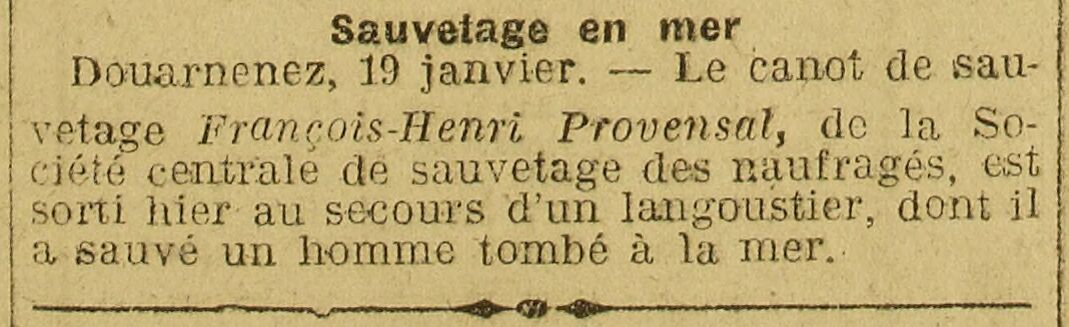 Journal La Liberté Date 20 January 1926 Bateau(x) FRANÇOIS HENRY PROVENSAL II Canot de sauvetage - 1917 Mots-clés Sortie, Canot de sauvetage, Société centrale de sauvetage, Secours, Langoustier, Homme à la mer, Matelot sauvé Lieu(x) Douarnenez Contributeur(s) Jacques Join Image
