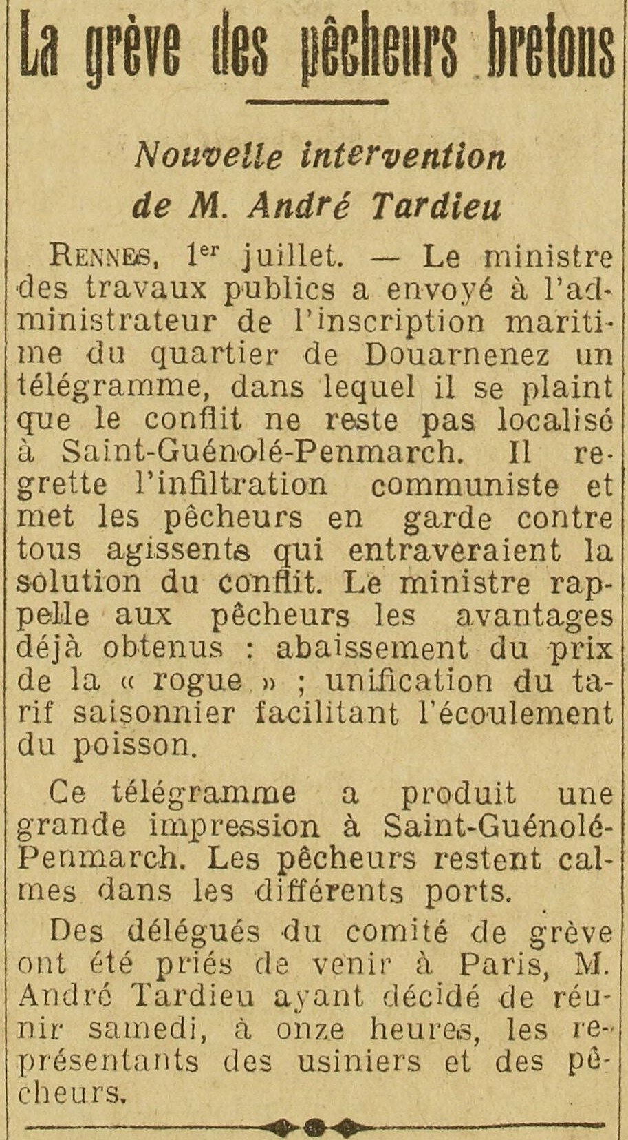 Journal La Liberté Date 02 July 1927 Mots-clés Grève, Pêcheurs bretons, Ministre des Travaux publics, Télégramme, Plainte, Administrateur, Extension, Conflit, Intervention, Communistes, Mise en garde, Rappel, Avantages, Rogue, Prix, Baisse, Invitation, Délégués, Comité de grève, Réunion Lieu(x) Rennes, Douarnenez, Saint-Guénolé, Penmarc'h, Paris Personnes André Tardieu Contributeur(s) Jacques Join Image