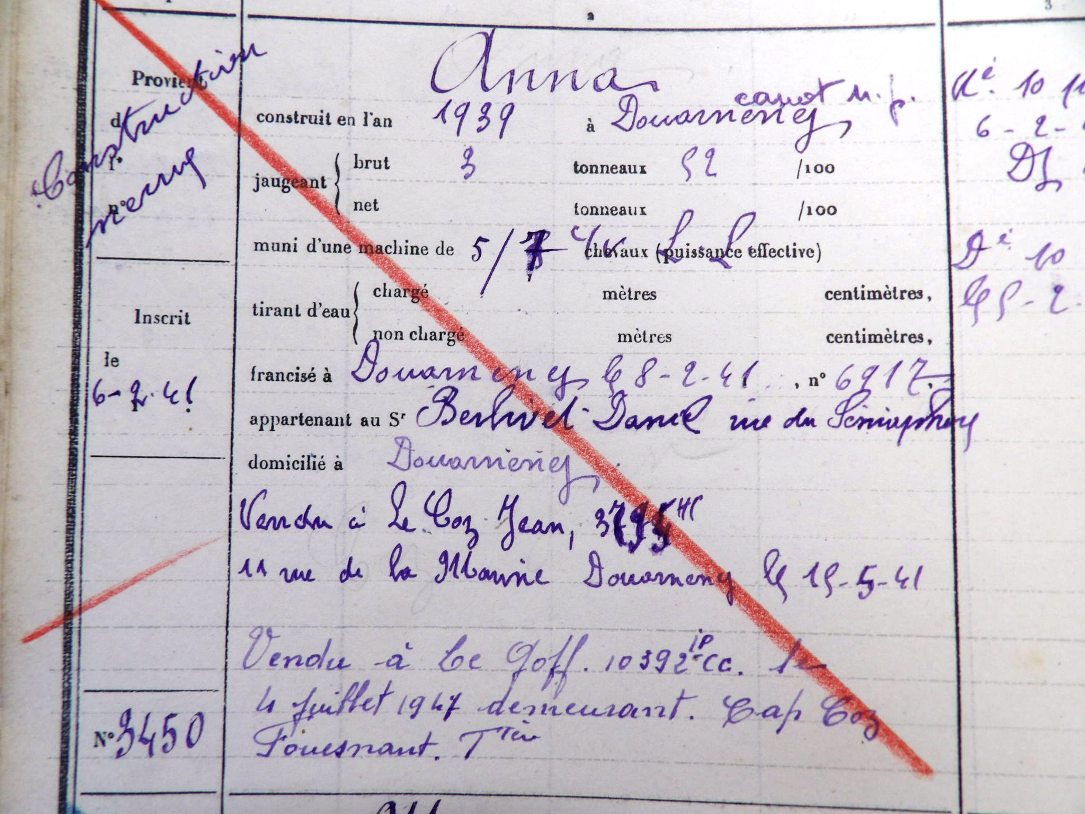 "Plus tard (après le Gazard DZ3426), j'ai encore fait un de 7 mètres, demi-ponté, avec un moteur de 12 chevaux (ANNA DZ3450, construit en 1941 pour Jean Le Coz au chantier Rochedreux, au Rosmeur, et envoyé à l'eau à la main en présence de sa fille Marie-Thérèse Le Coz). C'est celui que j'ai le plus regretté. On faisait le chalut, le long des côtes, et ça donnait bien (carrelets, soles, crevettes, et araignées en saison). J'ai dû le vendre pour que la Réquisition m'aide à construire un plus grand"...