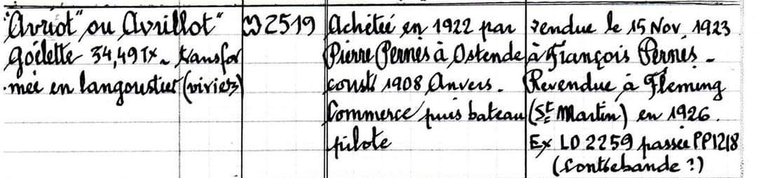 Campagne de pêche à la langouste aux Antilles du 9/12/1924 au 16/04/1925 (sans passer par la Mauritanie) : en 1924 le capitaine François Pernès, à la barre de l’Avriot met le cap sur les Antilles. Après quelques mois, il revient avec 7,5 tonnes de langoustes roses, sans mortalité, à 10,52 francs le kg, qu’il aura toutes les misères du monde à commercialiser. (http://www.disons.fr/?p=3669)