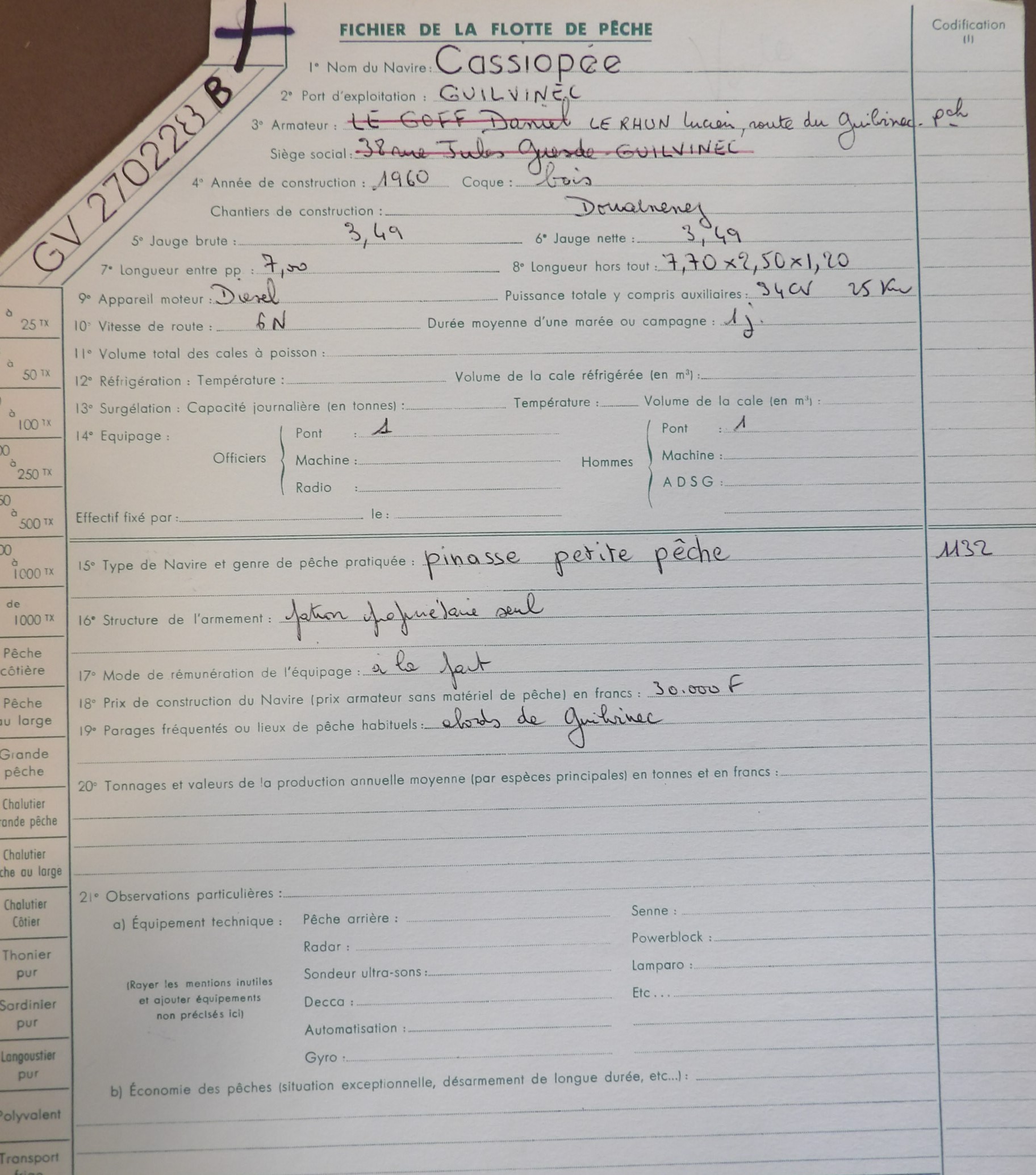 C'est une pinasse bois construite en 1960 à Douarnenez. Ce navire est à la plaisance au quartier du Guilvinec sous le nom "COMMANDANT BRIAN" (GV4080) en décembre 1966, utilisé par l'EAM du Guilvinec. Il est armé à la pêche professionnelle en GV en janvier 1975 et prend l'immatriculation 270228 à cette occasion, repris par Daniel LE GOFF du Guilvinec. Il repasse DZ en 1983. On le trouve pour l'année 1987 en "professionnel non armé" dans le listing des affaires maritimes. Il passe ensuite plaisance à DZ sous le nom de "SOLDAT LOUIS" et est détruit en 10.1993.