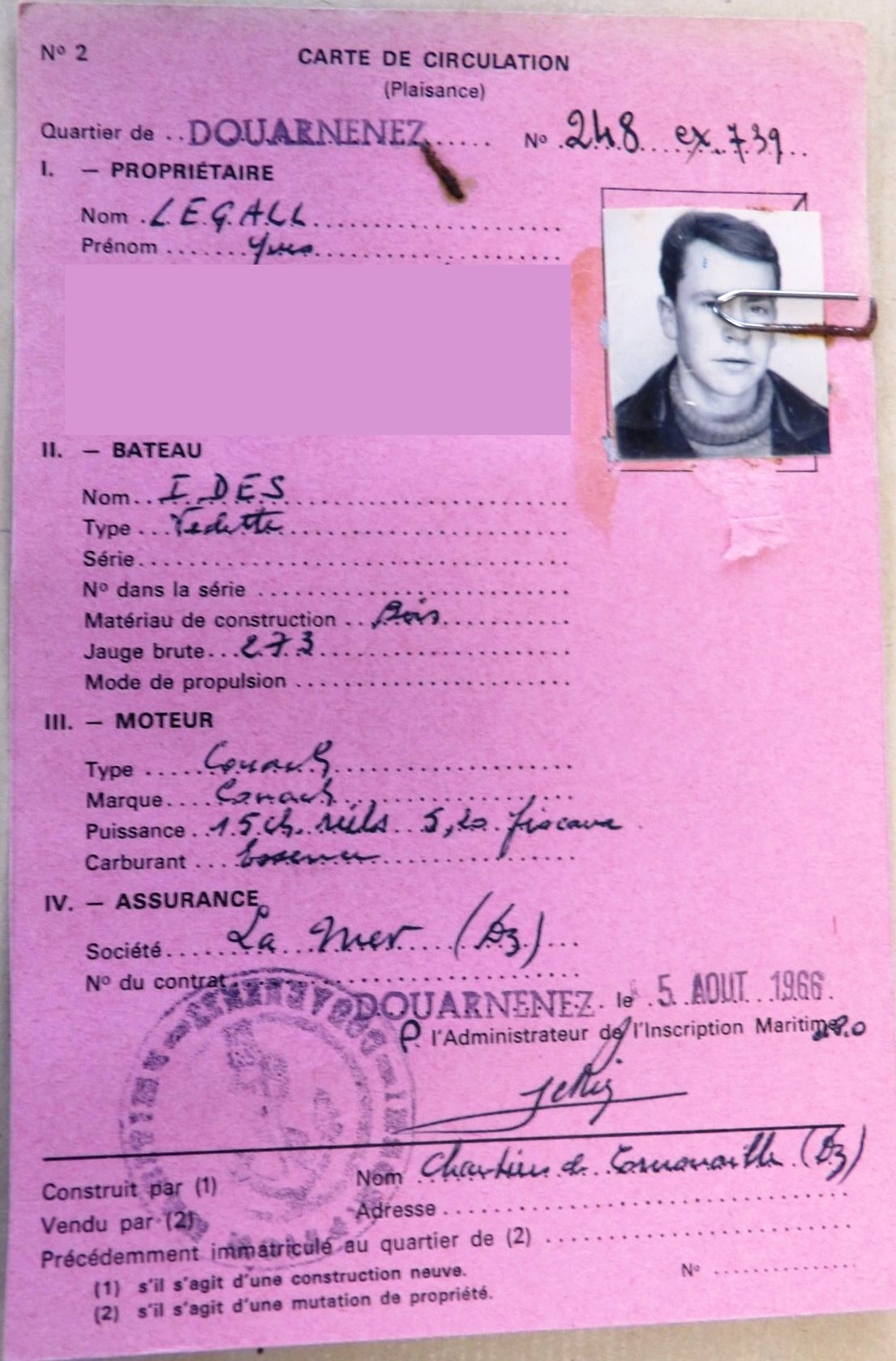 "IDES" (DZ3810). Le navire est passé à Audierne en 04.1952 sous le numéro Au2342. Il est revenu en plaisance à DZ, pour Yves Le Gall, en 1964 : DZ739, puis DZ248 à la renumérotation du fichier plaisance de 1966.