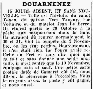 Journal Le Progrès du Finistère. Principal Date 22 novembre 1930 Bateau(x) YOUEN - DZ2498 Canot non ponté - 1923-1950 Mots-clés Canot, Pêche au maquereau, Baie, Tempête, Sans nouvelle, Relâche, Retour au port, Équipage sauf Lieu(x) Douarnenez, Rue Voltaire, Baie de Douarnenez, Le Fret, Camaret Personnes patron Yves Tanguy, matelot Jean Le Berre Contributeur(s) Jacques Join Image