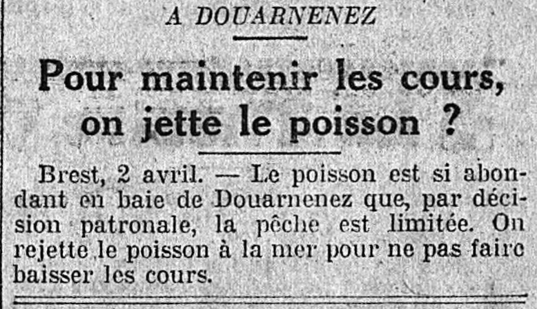 Journal L'Intransigeant Date 03 avril 1925 Mots-clés Pêche abondante, Baie, Décision, Limitation pêche, Maintien, Prix, Cours, Rejet à la mer Lieu(x) Douarnenez, Brest, Baie de Douarnenez Contributeur(s) Jacques Join Image