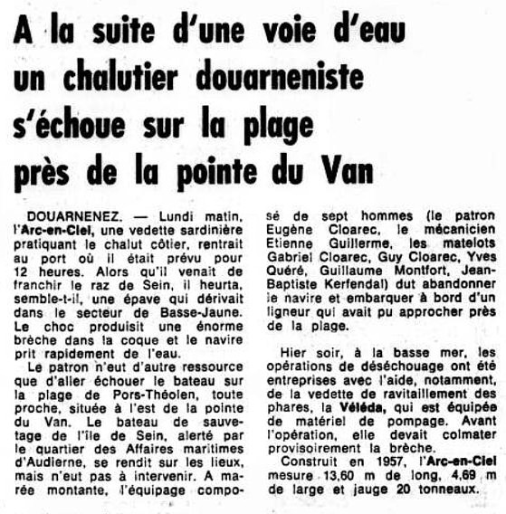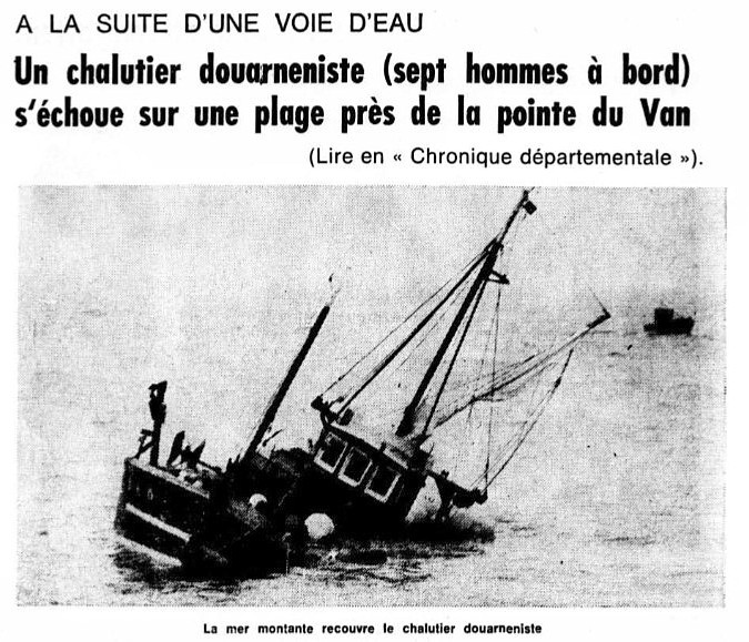 Patron Eugène Cloarec, Mécanicien Étienne Guillerme, Matelots : Gabriel Cloarec, Guy Cloarec, Yves Quéré, Guillaume Monfort, Jean-Baptiste Kerfendal,
