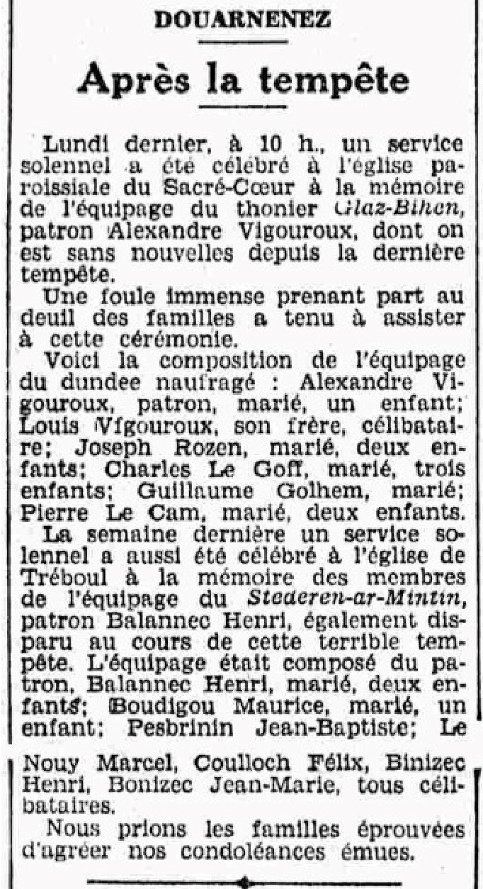 patron Alexandre Vigouroux, Louis Vigouroux, Joseph Rozen, Charles Le Goff, Guillaume Golhen, Pierre Le Cam, patron Henri Balannec, Maurice Boudigou, Jean-Baptiste Perhirin, Marcel Le Nouy, Félix Coulloch, Henri Bonizec, Jean-Marie Bonizec
