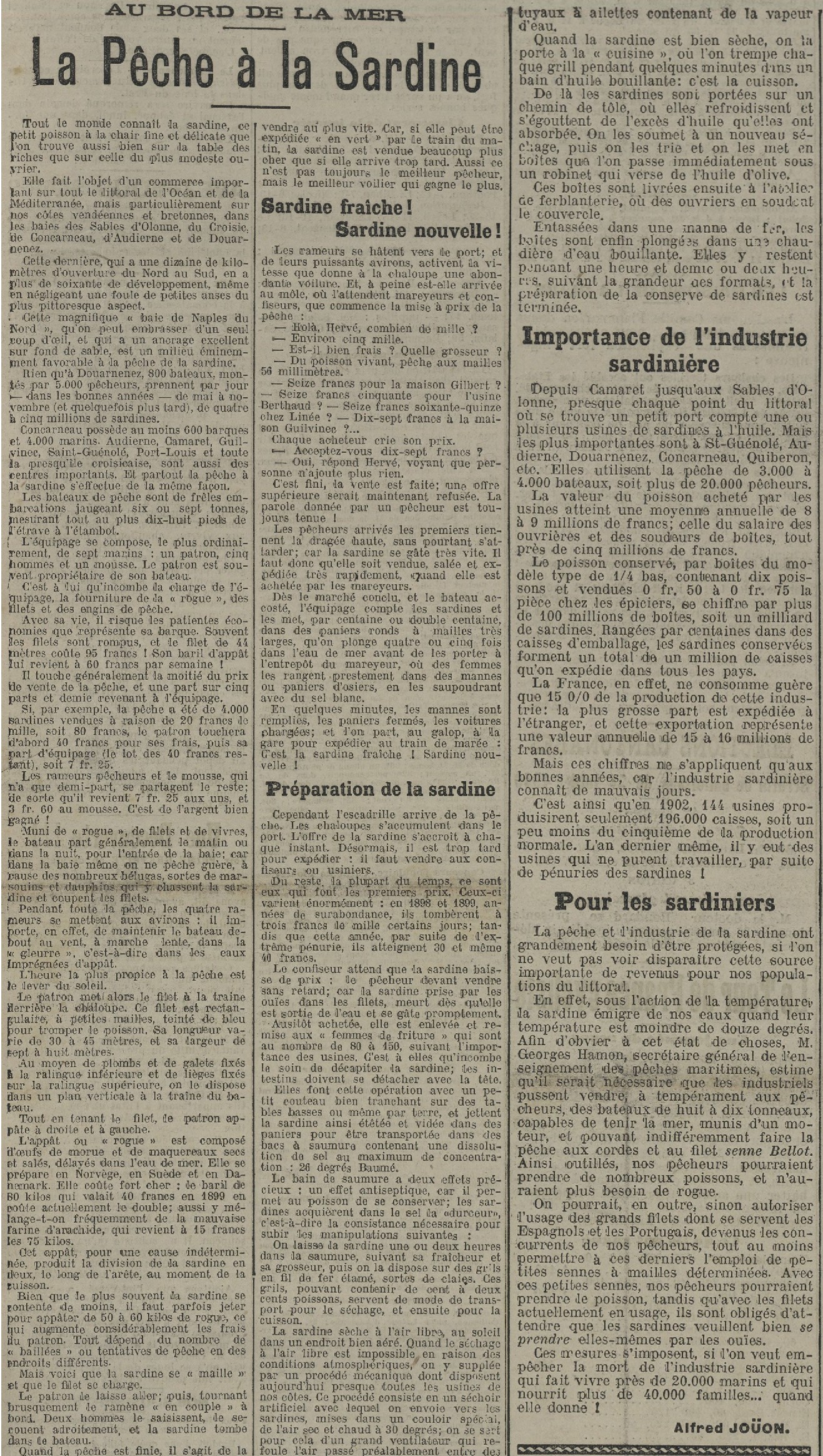 Sardine, Commerce, Baie, Chaloupes, Équipages, Rogue, Filets, Engins, Salaire à la part, Bélugas, Marsouins, Dauphins, Appât, Farine d'arachide, Maillage, Expédition en vert, Mise à prix, Paniers, Mannes, Confiseurs, Usiniers, Femmes de friture, Saumure, Grils, Séchage, Mise en boîte, Huile d'olive, Ferblantiers, Soudeurs, Conserves, Industrie, Chiffres, Exportation, Pénurie, Motorisation, Palangres, Senne Belot, Petite senne, Mesures, Protection