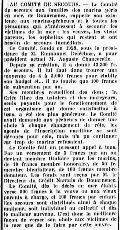 Journal Le Progrès du Finistère. Principal Date 25 février 1939 Mots-clés Comité de secours, Familles, Péris en mer, Victimes, Veuves, Orphelins, Subvention, Dons, Générosité, Inscription maritime, Cotisations, Œuvre, Obole, Distribution Lieu(x) Douarnenez Personnes Emmanuel Delécluze, Auguste Chancerelle Contributeur(s) Jacques Join Image
