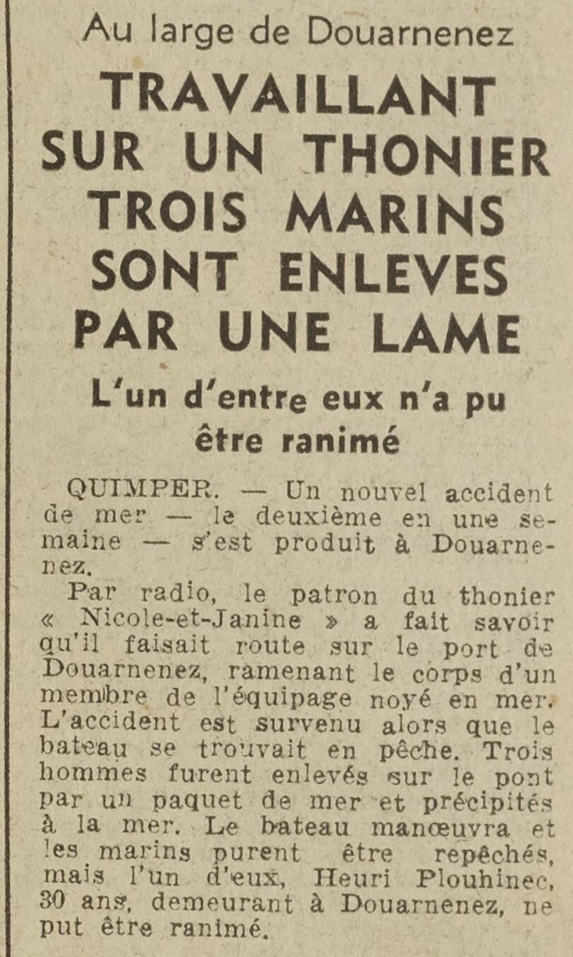 Journal Alger républicain Date 26 août 1951 Bateau(x) NICOLE JEANINE - DZ3788 Malamok - 1950-1974 Mots-clés Thonier, Accident, Lame, Matelot, Noyé, Retour au port, Paquet de mer, Homme à la mer, Manœuvre, Repêchage, Tentative, Réanimation Lieu(x) Douarnenez, Quimper Personnes Henri Plouhinec Contributeur(s) Jacques Join Image