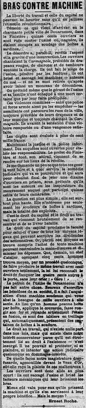 Ouvriers, Soudeurs, Soudage , Boîtes, Désordre, Insurrection, Chants, La Carmagnole, Drapeau rouge, Clairon, Tambour, Saccage, Usine, Machines à sertir, Violences, Victoire, Vengeance, Dégâts, Évaluation, Enquête, Justice, Police, Responsabilité, Préfet, Révolte, Prison, Capital, Exploitation, Droit au travail, Dividende, Actionnaires, Machine, Main d'oeuvre, Diminution, Coût de production, Augmentation, Bénéfices