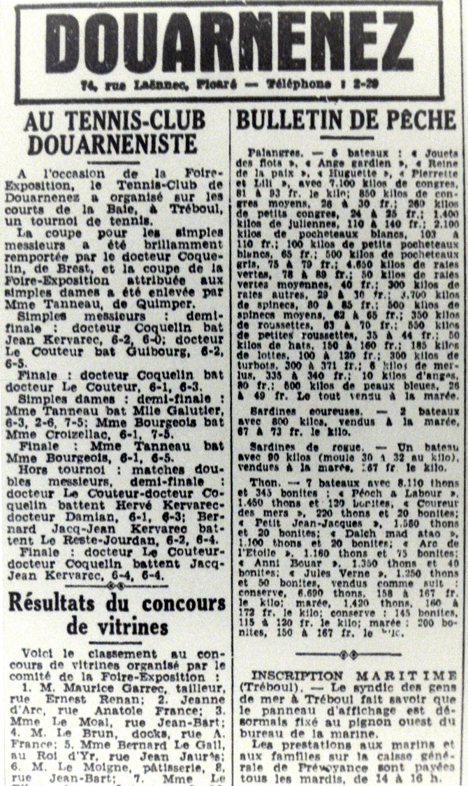 Journal Le Télégramme de Brest Date 16 juillet 1952 Bateau(x) JOUET DES FLOTS - DZ3333 Pinasse - 1937-1961 L'ANGE GARDIEN - DZ3783 Pinasse - 1950 REINE DE LA PAIX - DZ3382 Pinasse - 1939 HUGUETTE - DZ3128 Pinasse - 1932-1951 PIERRETTE ET LILY - DZ3147 Pinasse - 1933-1958 PEOC'H HA LABOUR - RÉVÉREND PÈRE BROTTIER - DZ3719 Malamok - 1947-1970 COUREUR DES MERS - DZ3681 Malamok - 1945 PETIT JEAN-JACQUES - POD HERVE - DZ3749 Malamok - 1948 DARCH MAD - MARIE FRANÇOIS - DALC'H MAD ATAO - DZ3633 Dundee ponté - 1942 ARC DE L'ETOILE - DZ3664 Malamok - 1944 ANNI BOUAR - DZ3703 Malamok - 1946 JULES VERNE - DZ3702 Malamok - 1946-1953 Mots-clés Criée, Prix, Quantité, Palangre, Sardine, Thon, Panneau d'affichage Lieu(x) Douarnenez Contributeur(s) Jean-Claude Bourdon Image