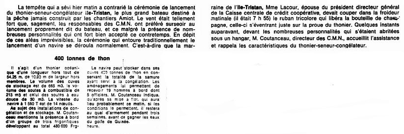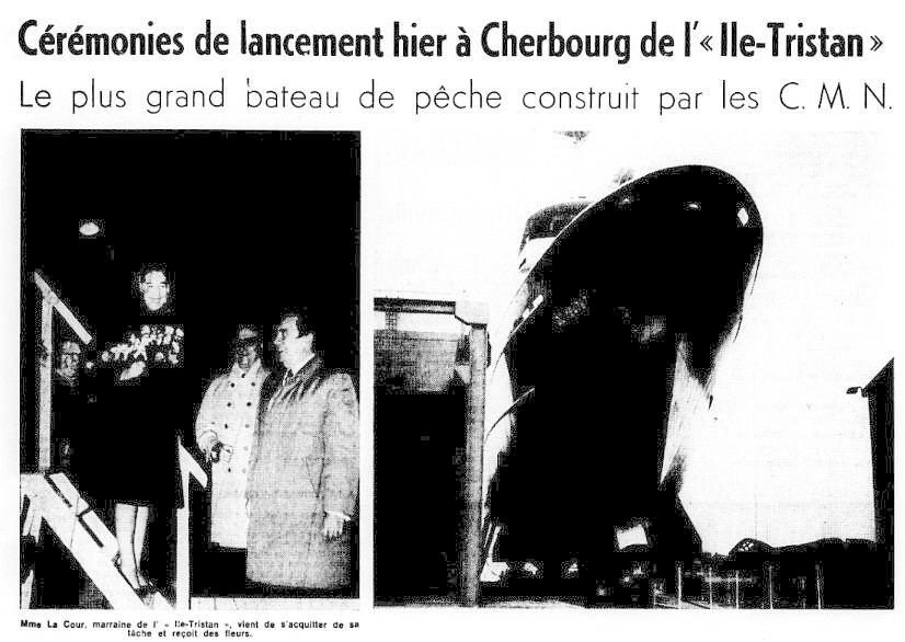 Cérémonies de lancement hier à Cherbourg de l"Ile Tristan". Le plus grand bateau de pêche construit par les C.M.N.