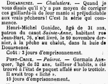 Journal Le Courrier du Finistère Date 17 décembre 1898 Bateau(x) SAINTE ANNE D'AURAY - ADZ1770 Chaloupe - 1886-1896 Mots-clés Drague, Chalut, Délit, Amende, Prison Lieu(x) Douarnenez Personnes Henri Michel Gonidec Contributeur(s) Jean-Claude Bourdon Image