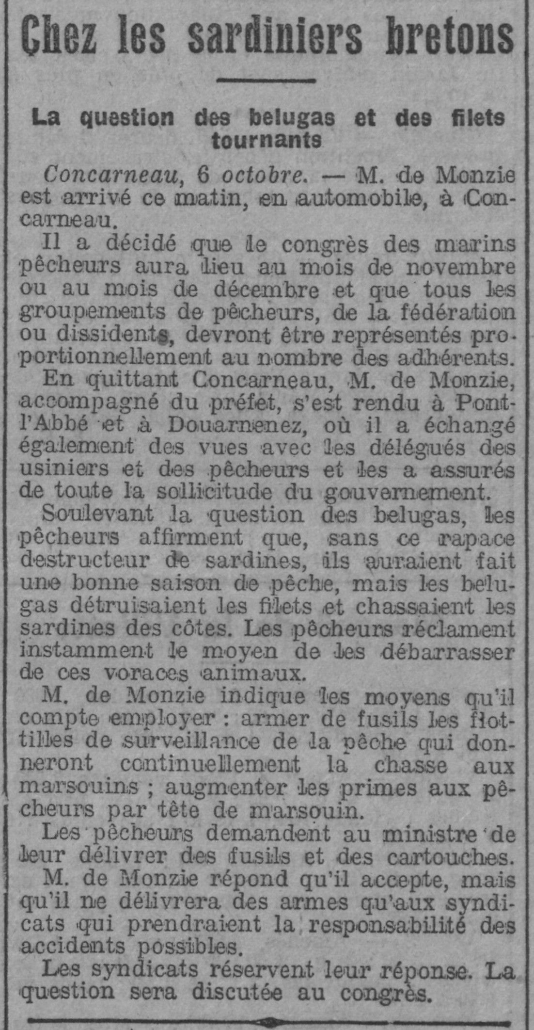 Journal L'Homme libre Date 07 octobre 1913 Mots-clés Ministre de la Marine marchande, Rencontre, Délégués, Usiniers, Pêcheurs, Sardiniers, Bélugas, Destruction, Filets, Dotation, Fusils, Bâtiments de surveillance, Chasse, Marsouins, Augmentation, Primes, Capture, Syndicats, Responsabilité, Accident, Discussion, Congrès des pêches Lieu(x) Concarneau, Pont-l'Abbé, Douarnenez Personnes M. de Monzie Contributeur(s) Jacques Join Image