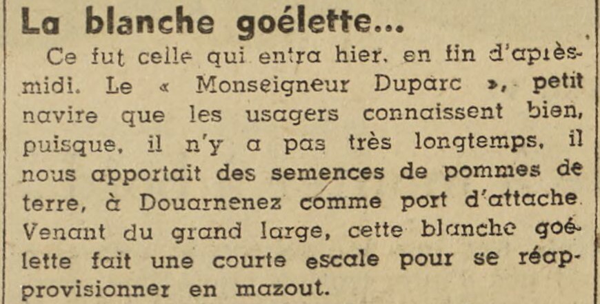 Journal Le Petit Marocain Date 21 août 1947 Bateau(x) MONSEIGNEUR DUPARC - DZ3708 Divers caboteur - 1946-1965 Mots-clés Escale, Goélette, Caboteur, Port d'attache, Transport de pommes de terre, Approvisionnement, Mazout Lieu(x) Casablanca, Douarnenez Contributeur(s) Jacques Join Image