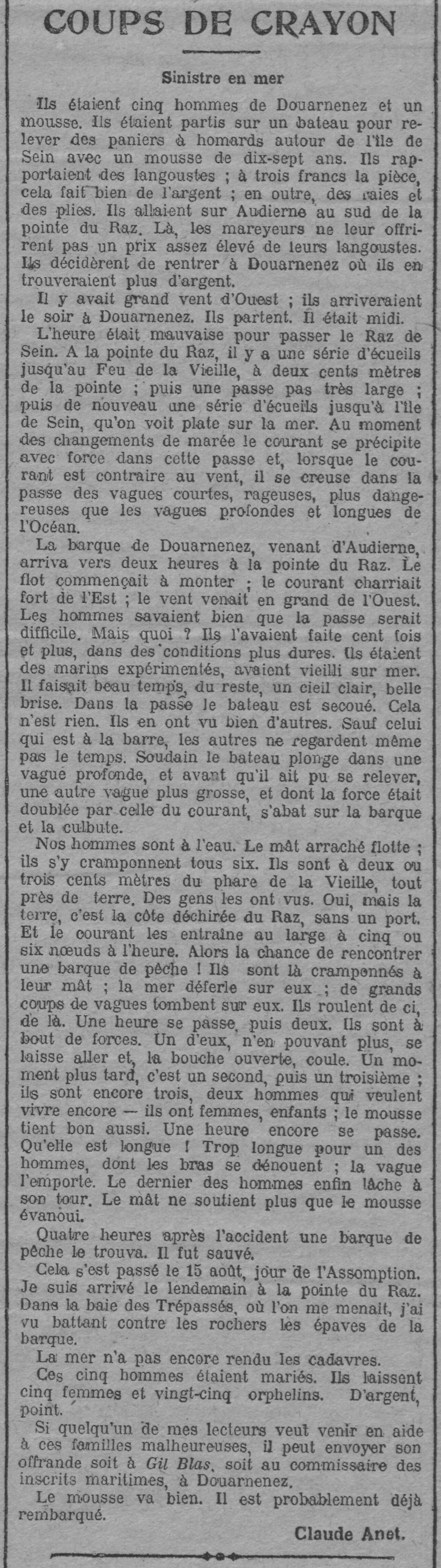 Journal Gil Blas Date 23 août 1907 Bateau(x) VAUTOUR - DZ825 Chaloupe - 1901-1907 Mots-clés Sinistre, Naufrage, Chaloupe, Casiers, Langoustes, Raies, Plies, Mauvais temps, Écueils, Courant, Vagues, Hommes à la mer, Mât, Mousse sauvé, Baie, Rochers, Épaves, Cadavres, Femmes, Veuves, Orphelins, Familles, Aide, Offrande Lieu(x) Douarnenez, Île de Sein, Audierne, Pointe du Raz, Raz de Sein, La Vieille, Baie des Trépassés Personnes Claude Anet Contributeur(s) Jacques Join Image