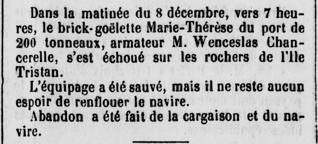 Journal L'Impartial du Finistère Date 13 décembre 1882 Bateau(x) MARIE THÉRÈSE - ADZ343 Brick goélette, Divers - 1869-1882 Mots-clés Brick-goélette, Échouement, Rochers, Équipage sauvé, Abandon, Renflouement, Cargaison Lieu(x) Douarnenez, Île Tristan Personnes Wenceslas Chancerelle Contributeur(s) Jacques Join Image