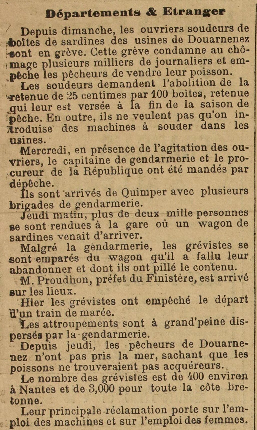 Grève, Conflit social, Ouvriers, Soudeurs, Boîtes, Conserves, Chômage, Revendications, Suppression, Retenue sur salaires, Opposition, Installation, Machines à sertir, Usines, Agitation, Gendarmes, Procureur de la République, Pillage, Wagon, Sardines, Gare, Arrivée, Préfet, Réclamation