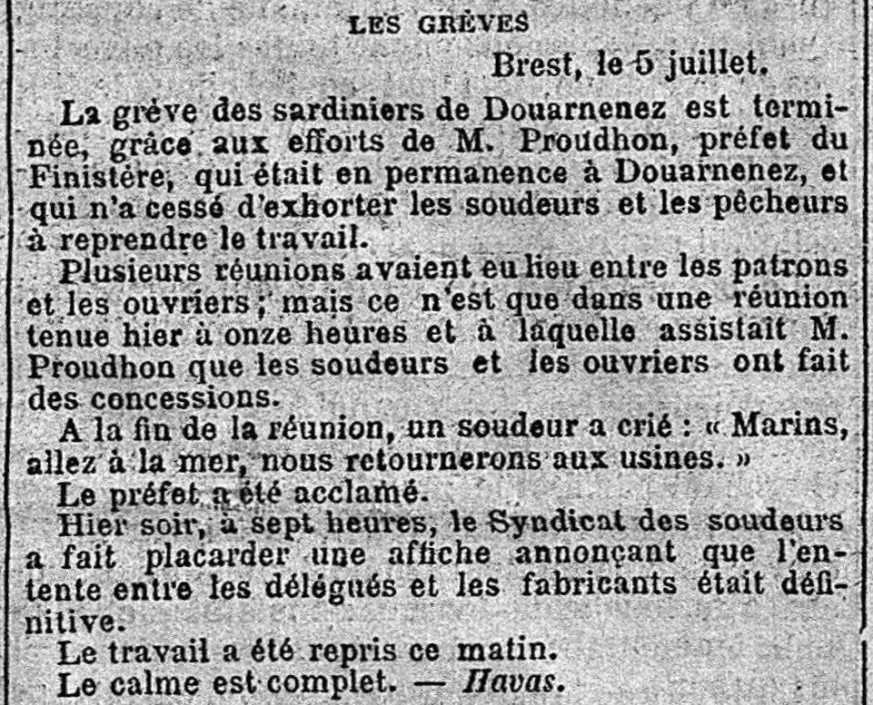 Journal Journal des débats Date 07 juillet 1896 Mots-clés Soudeurs, Pêcheurs, Sardiniers, Grève, Conflit terminé, Préfet, Réunion, Concessions, Acclamations, Affiche, Syndicat, Entente, Reprise, Travail, Calme Lieu(x) Brest, Douarnenez Personnes M. Proudhon Contributeur(s) Jacques Join Image