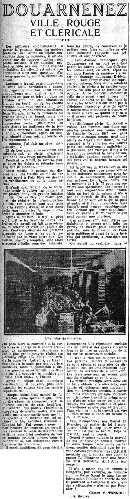 Ville, Ville rouge, Pêcheurs, Sardinières, Chansons, Chants, Sardine à l'huile, Boîtes, Préparation, Sertissage, Soudage mécanique, Stérilisation, Fabrication, Conserves, Industrie sardinière, Pêche à la sardine, Pêche au sprat, Pêche au maquereau, Pêches saisonnières, Femmes d'usine, Salaires, Travail de nuit, Grèves, Incidents, Usiniers, Mareyeurs, Maire, CGTU, Contrat, Pétrole, Essence
