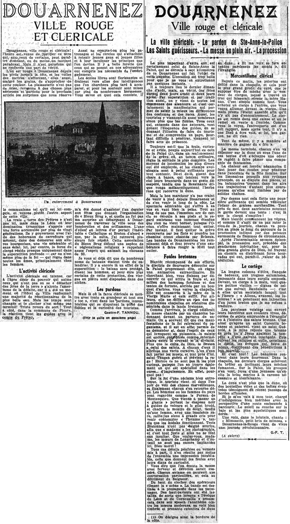 Ville, Ville rouge, Communistes, Clergé, Superstition, Foi, Femmes, Clocher, École libre, Kermesse, Pardon , Piété, Fidèles, Curiosité, Touristes, Pardon de Sainte-Anne, Fête, Tradition, Manifestation, Costumes, Foule, Forains, Chapelle , Messe, Culte, Saints, Guérison, Dévotion, Évêque, Pèlerins, Dune, Vêpres, Procession, Sermon, Bénédiction, Cortège, Paroisse, Bannière, Reliques, Défilé